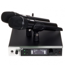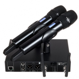 該套件包括2個EW-DX SKM-S(帶靜音開關(guān)的手持式發(fā)射機)、2個MMD 835音頭(心形、動圈)、1個EW-DX EM 2機架式接收器(2個通道)和2個BA 70可充電電池。