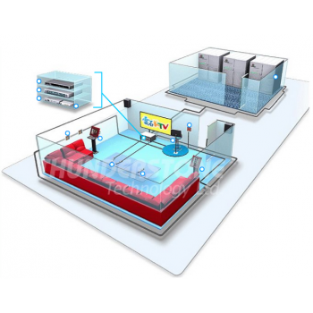 功用:在豪華包房中,通常有演唱臺,并有多臺電視機。AV分配器用于將機頂盒輸出的視頻信號分配成多路,輸出到演唱臺和多臺電視機上。
