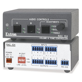 Extron RAC 104 四通道音量和音調遠程音頻控制器位于切換器和音頻功率放大器之間時,可提供四個通道用于音量和高低音的控制。它可配置用于在諸如教室和會議室環境的各種應用中,控制單聲道和立體聲音頻的分配。