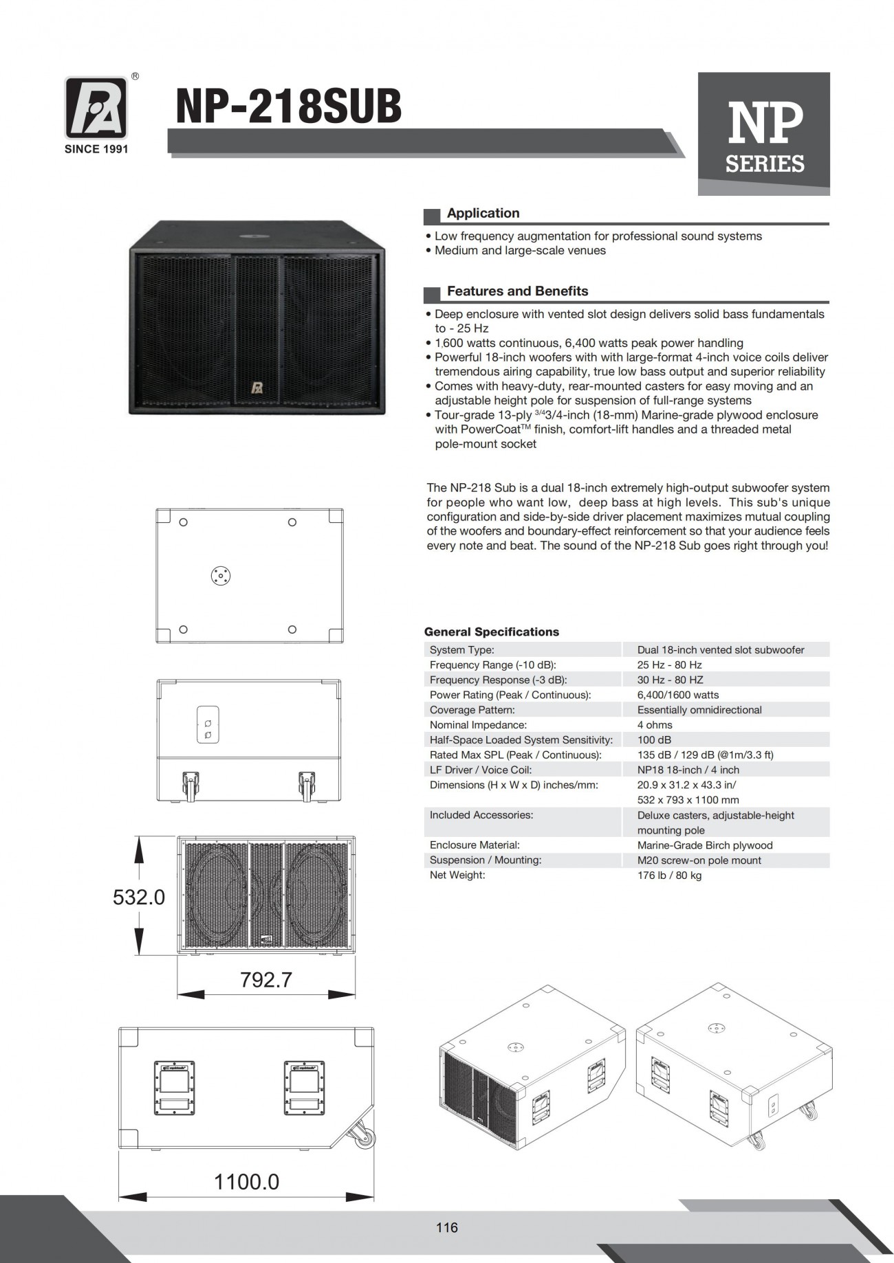 高指向性垂直音柱 高輸出/長沖程2''釹磁單元 阻抗:4 歐 /16 歐 可調節