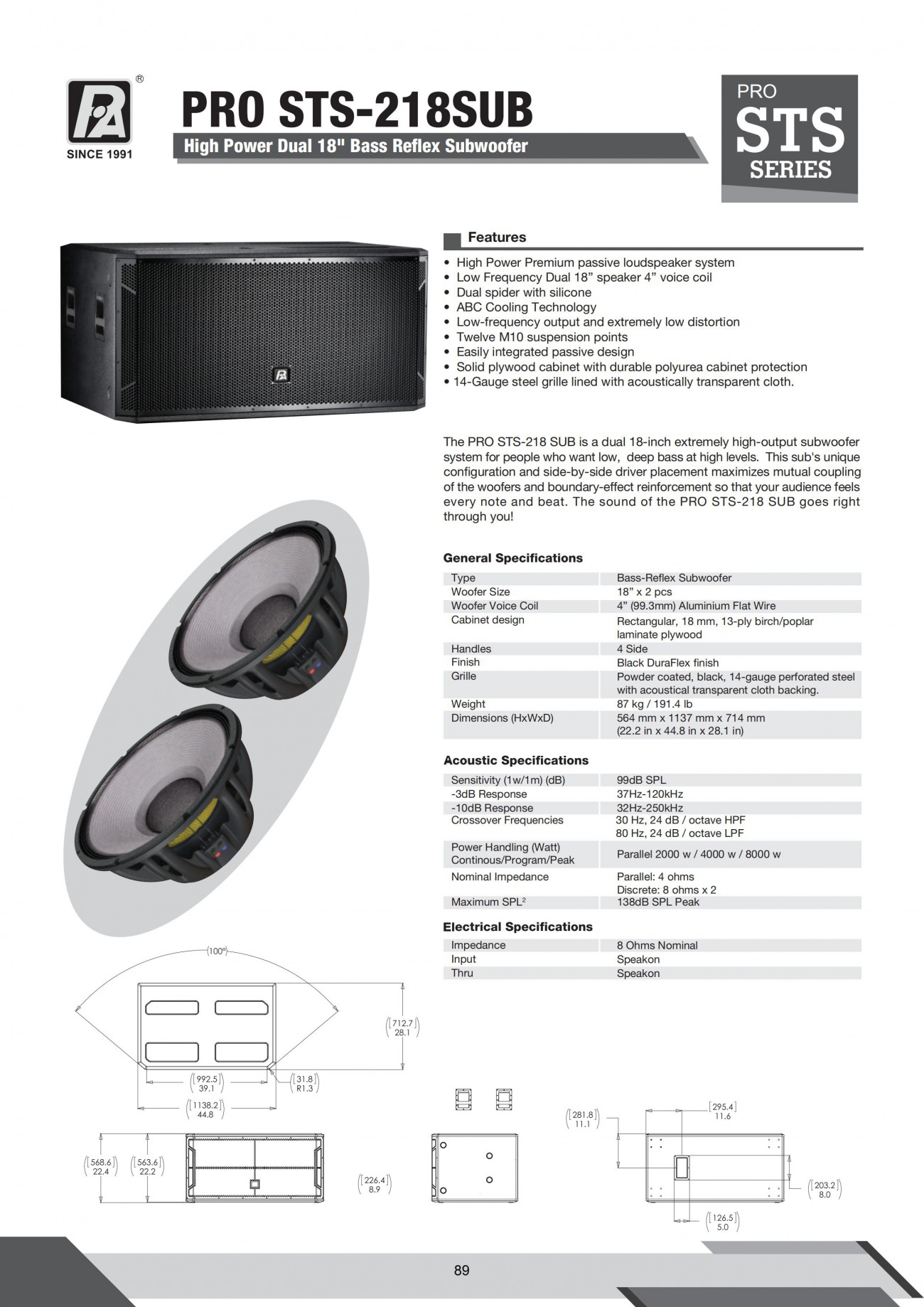 音:1寸 (1''音圈) 低音:8寸 (1.2''音圈) 阻抗:8 歐 靈敏度:89 dB
